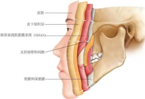 其实面部支持韧带分为真性韧带和假性韧带两种。真性韧带贯穿骨膜层和皮肤层;假性韧带贯穿浅筋膜(SMAS)层和皮肤层。而且面部支持韧带就像一棵大树,支撑着面部软组织,让软组织保持在正常的解剖位置,抵抗重力变化。由于面部衰老是全方位、多层次的,因此在衰老过程中,软组织下垂会牵扯着面部支持韧带,使得支持韧带不断被拉紧,时间久了便会变得松垮,没有弹性。所以要想实现全面部抗衰,恢复面部支持韧带是关键。