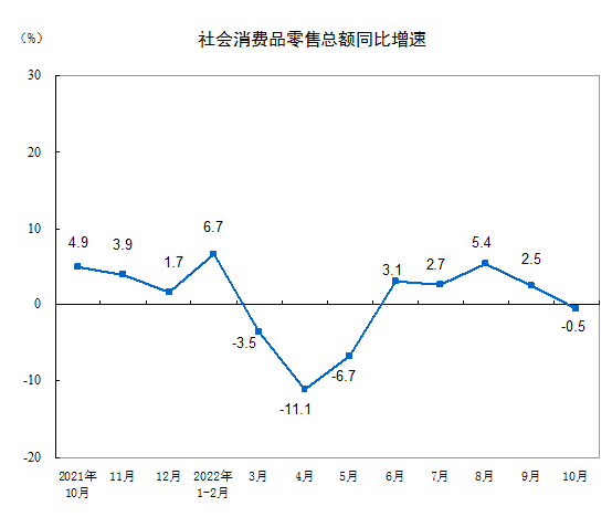 10月份社会消费品零售总额下降0.5% 餐饮、乘用车收入成拖累项