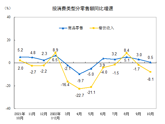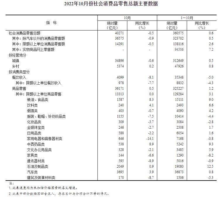 原标题:10月份社会消费品零售总额下降0.5% 餐饮、乘用车收入成拖累项