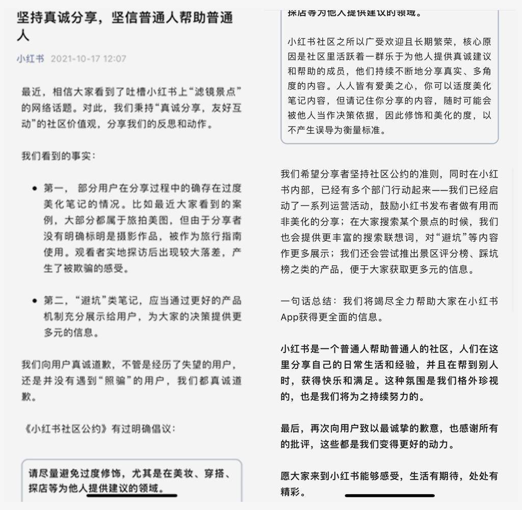 2021年国庆节期间,有网友晒出了自己所拍原图与小红书上图片的对比,直观展现了滤镜的美化能力。在这之后的10月17日,小红书通过官方微信公众号发出了题为《坚持真诚分享,坚信普通人帮助普通人》的致歉信,称会通过改善产品机制来帮助大家获得更全面的信息。