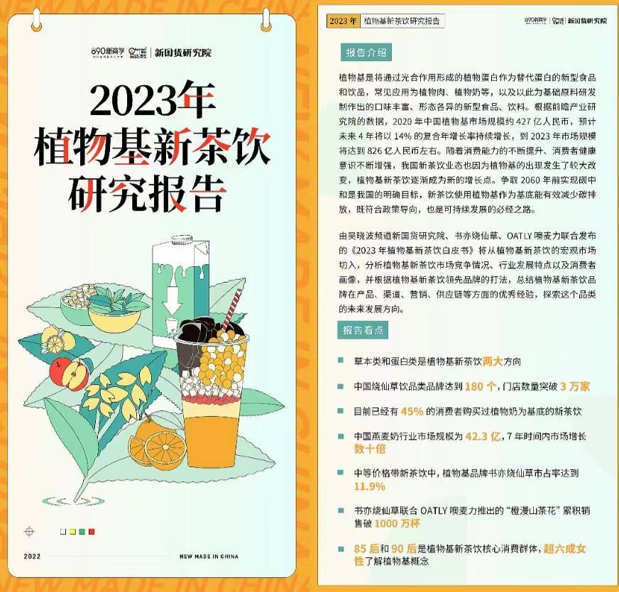 在这个关键节点,吴晓波频道新国货研究院联合书亦烧仙草和OATLY噢麦力共同发布2023年植物基新茶饮研究报告,从当前植物基新茶饮的宏观市场出发,详细阐述了当前植物基新茶饮的行业发展特点、市场竞争情况及未来的发展趋势。