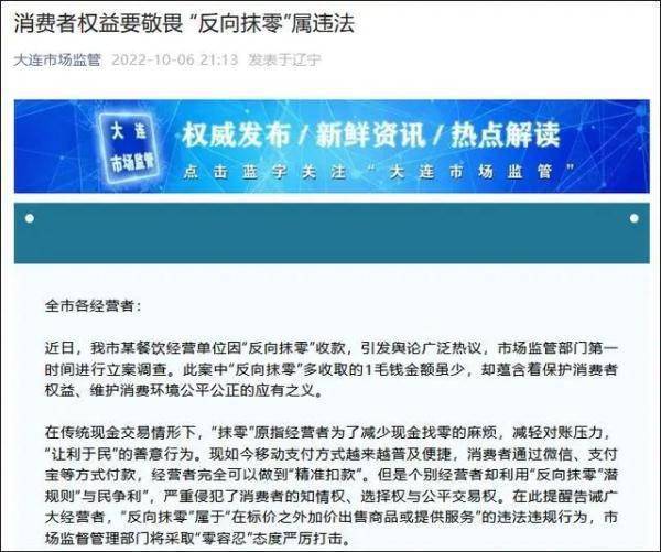 次日,大连市市场监督管理局发布文章《消费者权益要敬畏 “反向抹零”属违法》,再次回应此事。
