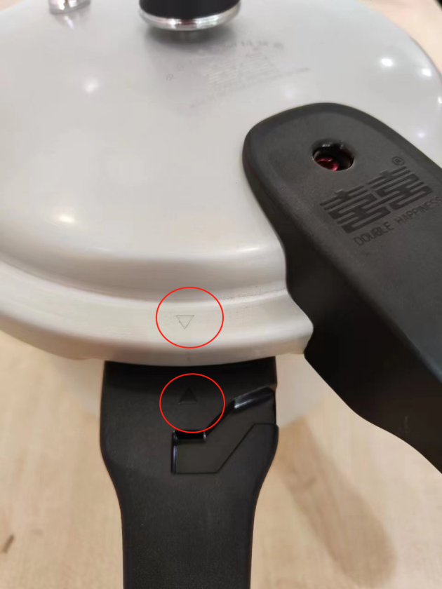 ④合盖:合盖时将锅盖上的“▽”标记与下方手柄上的“△”标记对正,扣好锅盖,按顺时针方向转动上手柄,直到上下手柄对齐,便是完全关合。新压力锅关合时,可用左手按压住锅盖,右手合力关合。