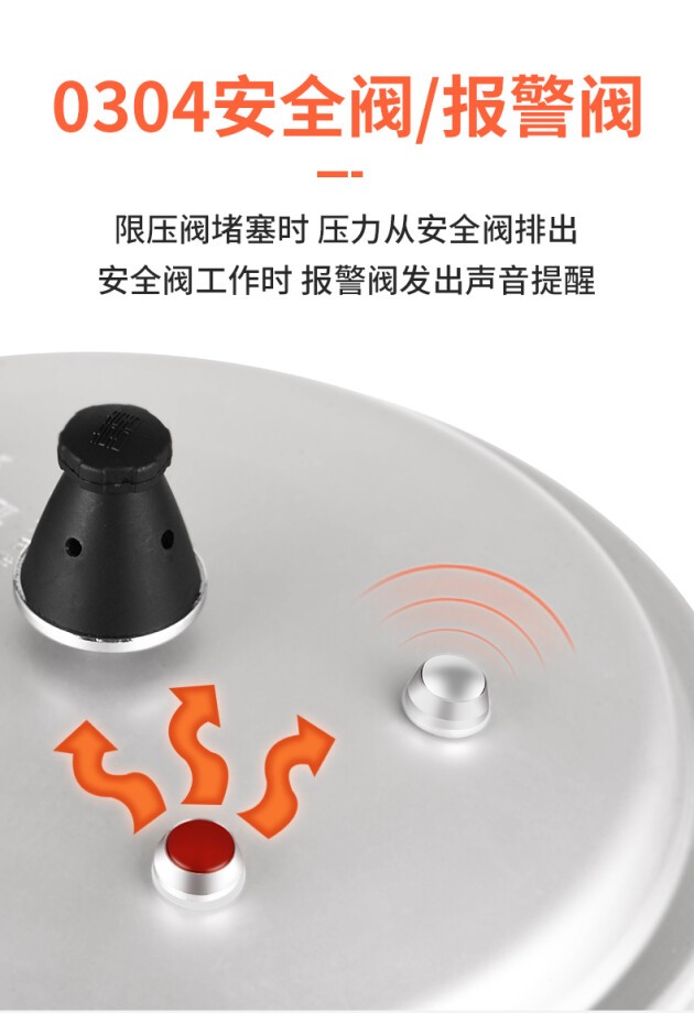 03安全阀、04报警阀:在烹调过程中,如遇到限压阀排气管堵塞的情况,则会造成锅内压力过高,这时候便通过安全阀排气,以保证压力锅的安全,相当于是压力锅排气的第二道阀门。当安全阀在排气时,报警阀会发出声音提醒,遇到这种情况,不用慌,但是,一定要在使用结束后清理防堵罩。