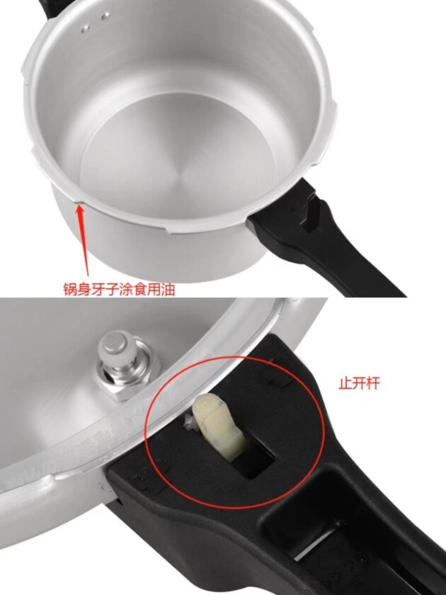 ②使用前检查锅身配件是否齐全外,还要检查排气管、防堵罩、自锁阀、安全阀是否清洁。