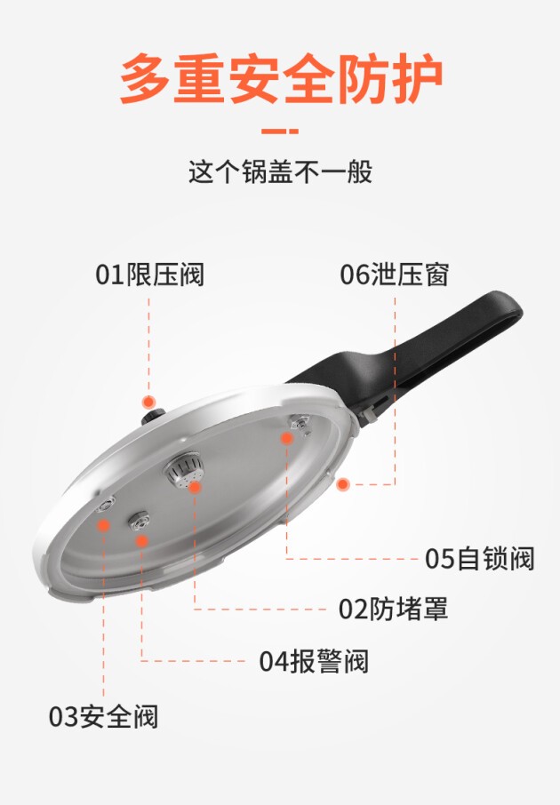05自锁阀:当压力锅内还有压力时,自锁阀是锁定的状态,这时候无法打开压力锅盖,要等压力完全排出后,才能打开。
