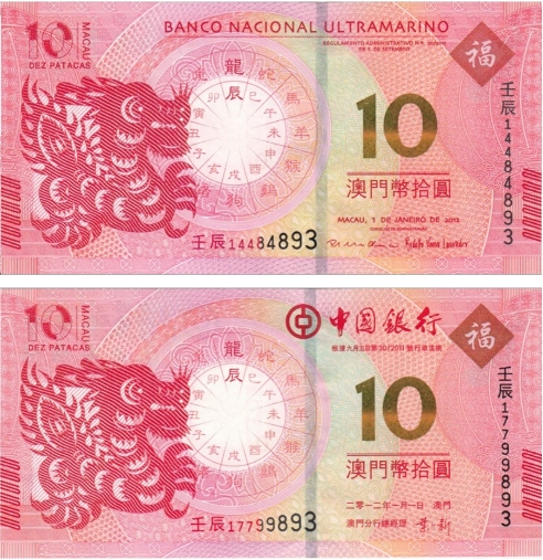 澳门生肖龙钞纪念钞,是由澳门特别行政区的中国银行和大西洋银行发行流通的特区纸钞,而非在原有流通纸币上加印文字或图案的“简易钞”。经过独立设计、印制的“专属生肖钞”,是中国首套以生肖为主题的纪念钞,也是唯一一套大陆、澳门、海外三方联合设计发行的纸钞,因此其拥有很高的艺术、收藏和观赏价值。