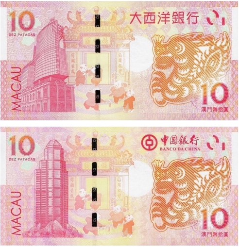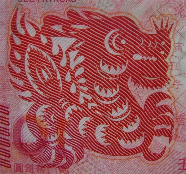 澳门生肖龙钞,在世界上首次使用了凹印对印技术,即钞面的正面和背面龙形图案,均采用了凹版印刷,形成对印。背面龙呈现橘黄色,四周为一圈橘黄色外环,对光观察正好构成正面红龙的橘黄色外环,极为精美。