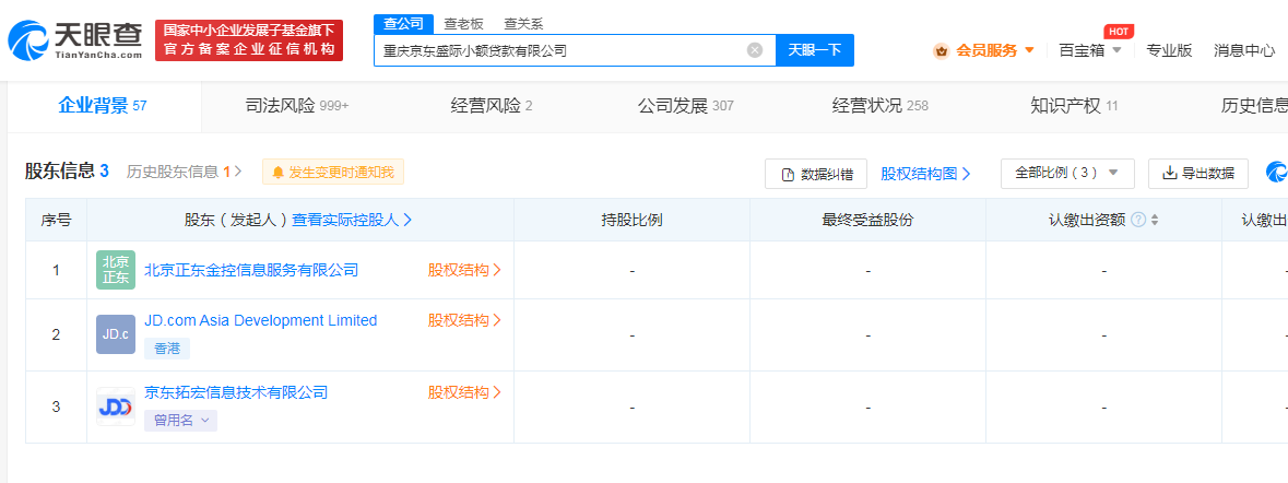股东信息显示,该公司由JD.com Asia Devel opment Limited、京东拓宏信息技术有限公司、北京正东金控信息服务有限公司共同持股。