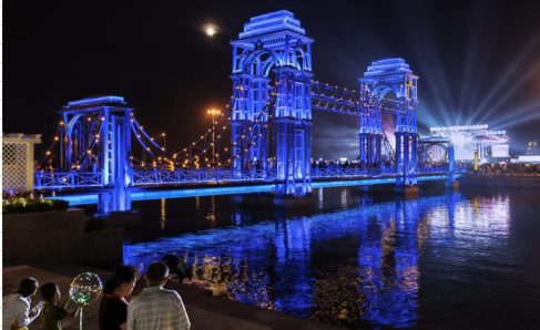 您可以去看看蓝桥,夜晚正是展现它高颜值的 时机,整个桥体呈现出通透的蓝色,如梦似幻。