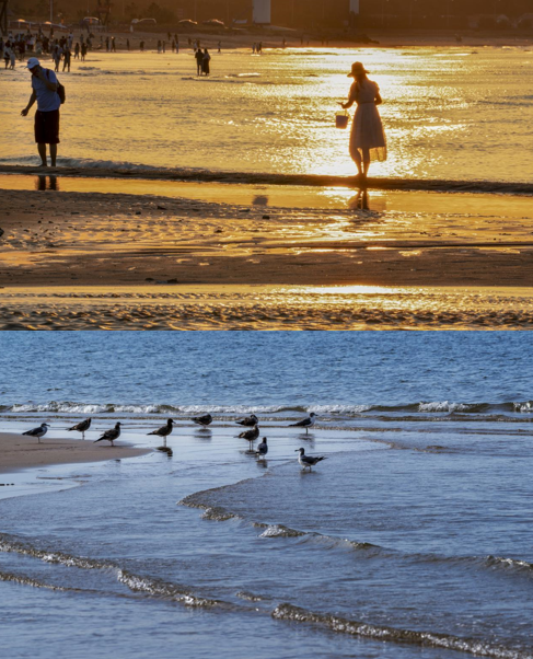 也可以在夜晚来到海边,看水银似的月光肆无忌惮的泻在海岸上,泻在波澜壮阔的海面,赤脚踩在金黄色的沙滩上,就这么静静的走,多说一句话都是破坏这意境,相爱的人之间的一个眼神、一个举手投足,都会让彼此明白对方的心意。