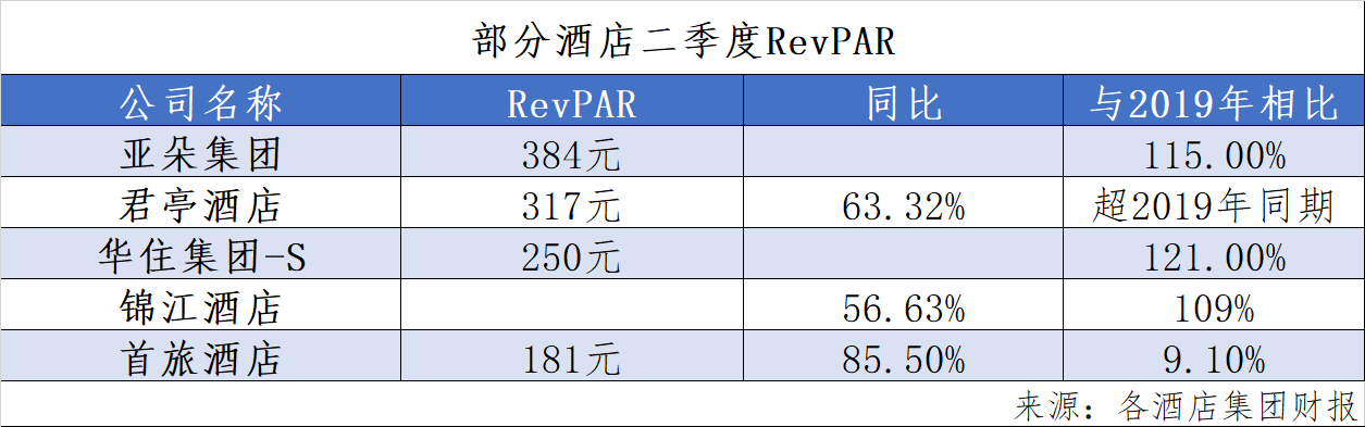 首先从第二季度RevPAR来看,锦江集团第二季度境内酒店RevPAR同比增长56.63%,恢复至2019年同期的109.30%;华住集团RevPAR为250元,恢复至2019年二季度的121%;亚朵集团RevPAR为384元,达到2019年同期的114.8%;首旅酒店方面则是,不含轻管理酒店,全部酒店RevPAR为181元,同比上升85.5%,超过2019年同期9.1%。