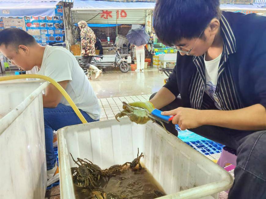图说:江杨路水产市场内,商户正在清洗大闸蟹。 陈丽娜 摄