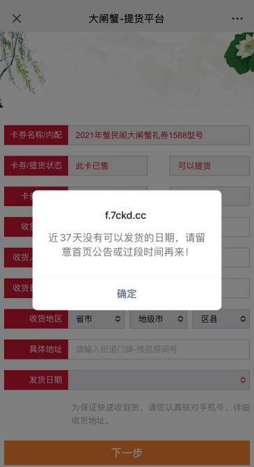 图说:刘女士反映大闸蟹预约兑换平台第一天就显示“近37天没有可以发货的日期”。图源:受访者