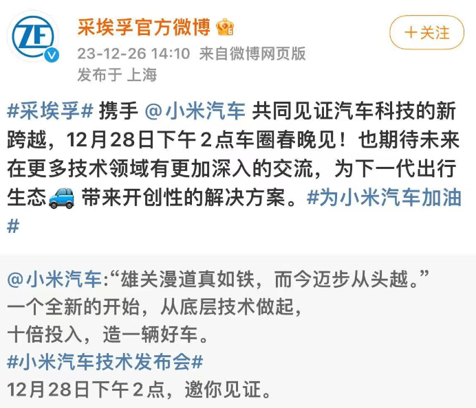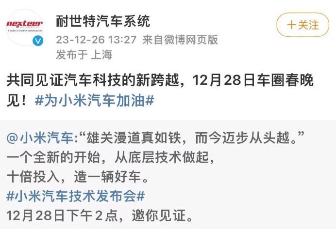 IT之家还发现,小米汽车技术发布会得到了多家汽车相关技术公司的“声援”,包括高德地图、英伟达、酷狗音乐、瑞声科技、耐世特汽车系统、采埃孚(汽车零部件供应商)、布雷博(汽车制动器系统供应商)、麦格纳(汽车零部件供应商)、普利司通(汽车轮胎供应商)等。