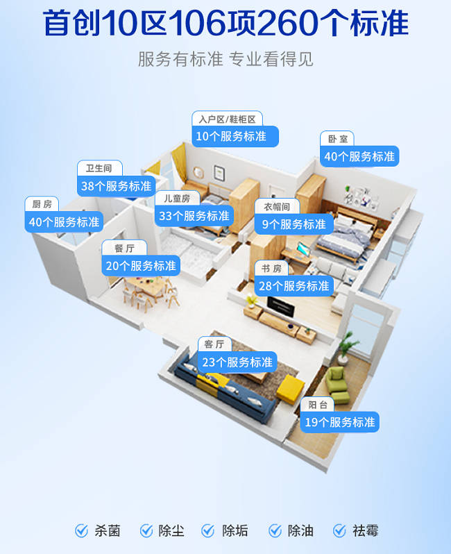 该公司采用直营管理模式,构建了高标准的家政服务体系,对服务流程、人员、技能以及保障等提出更高要求。其独创的“全屋10区,106个家务细项,260个服务标准”将无序的服务标准化、标准透明可视,为用户提供了全新的清洁体验,让用户在干净整洁和井井有条的居家环境中发现生活的美好。