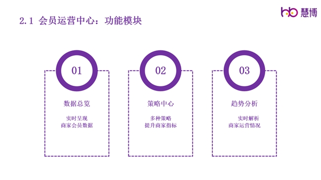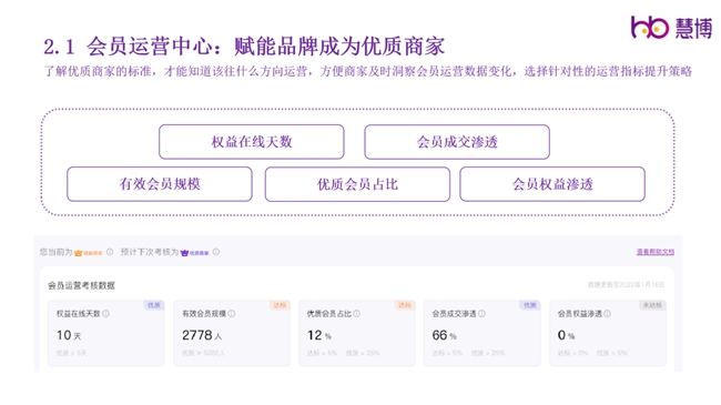 比如,”会员运营中心“功能板块,是慧博联合阿里共创的首家基于平台优质商家考核指标下的运营解决方案,通过数据总览、趋势分析、策略中心三大功能板块,帮助品牌更好更快的提升会员运营能力,顺利进阶优质商家,获得更多平台特权,实现会员价值提升带动CMV的增长。