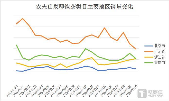 相较之下,农夫山泉虽然处于负面舆论的中心,但销量的变化远没有想象中那么显著。在拉取了马上赢线下零售监测网络中全国主要24省、自治区及直辖市,以及北京、浙江、广东、重庆等地区2月20日至3月10日的农夫山泉日销数据后可以发现,农夫山泉旗下包装水、即饮茶的全国销量并未出现非常剧烈的波动,整体销量仅有小幅下滑。