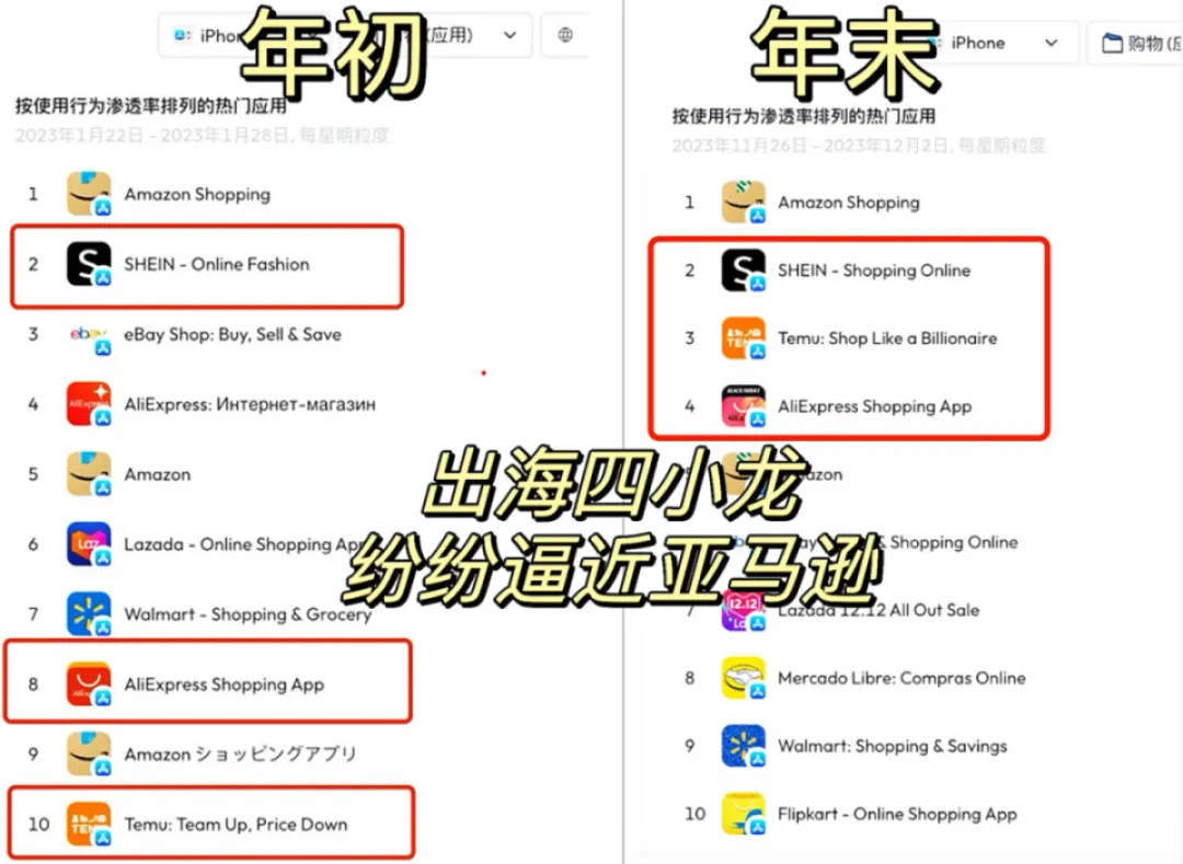 2023年1月份和11月份iOS全球购物类App渗透率排行