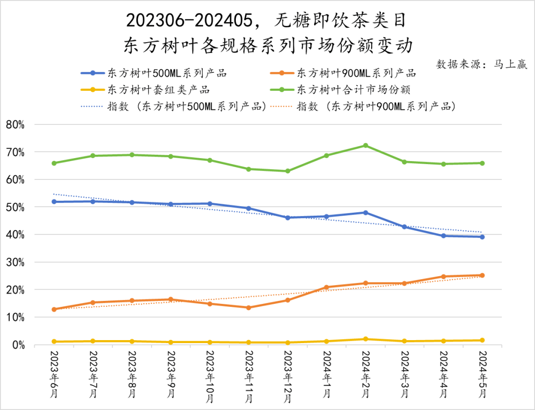可以看到,在东方树叶合计市场份额浮动不大的情况下,900ml系列产品的份额持续上涨,500ml份额的产品则持续下降,东方树叶正在通过大规格产品逐步替代常规规格产品,提升产品实际消费量(毫升)。