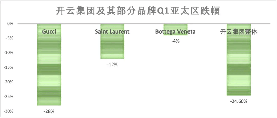 尽管没有公开Balenciaga和Givenchy的销售数据,但两个品牌的母公司开云集团和LVMH,第一季度在亚洲的销售额分别下滑了24.6%和6%。其中开云集团Q1在亚太区相比去年同期少卖近5亿欧元,集团旗下的Saint Laurent和Bottega Veneta分别在亚洲录得了12%和4%的销售额降幅。