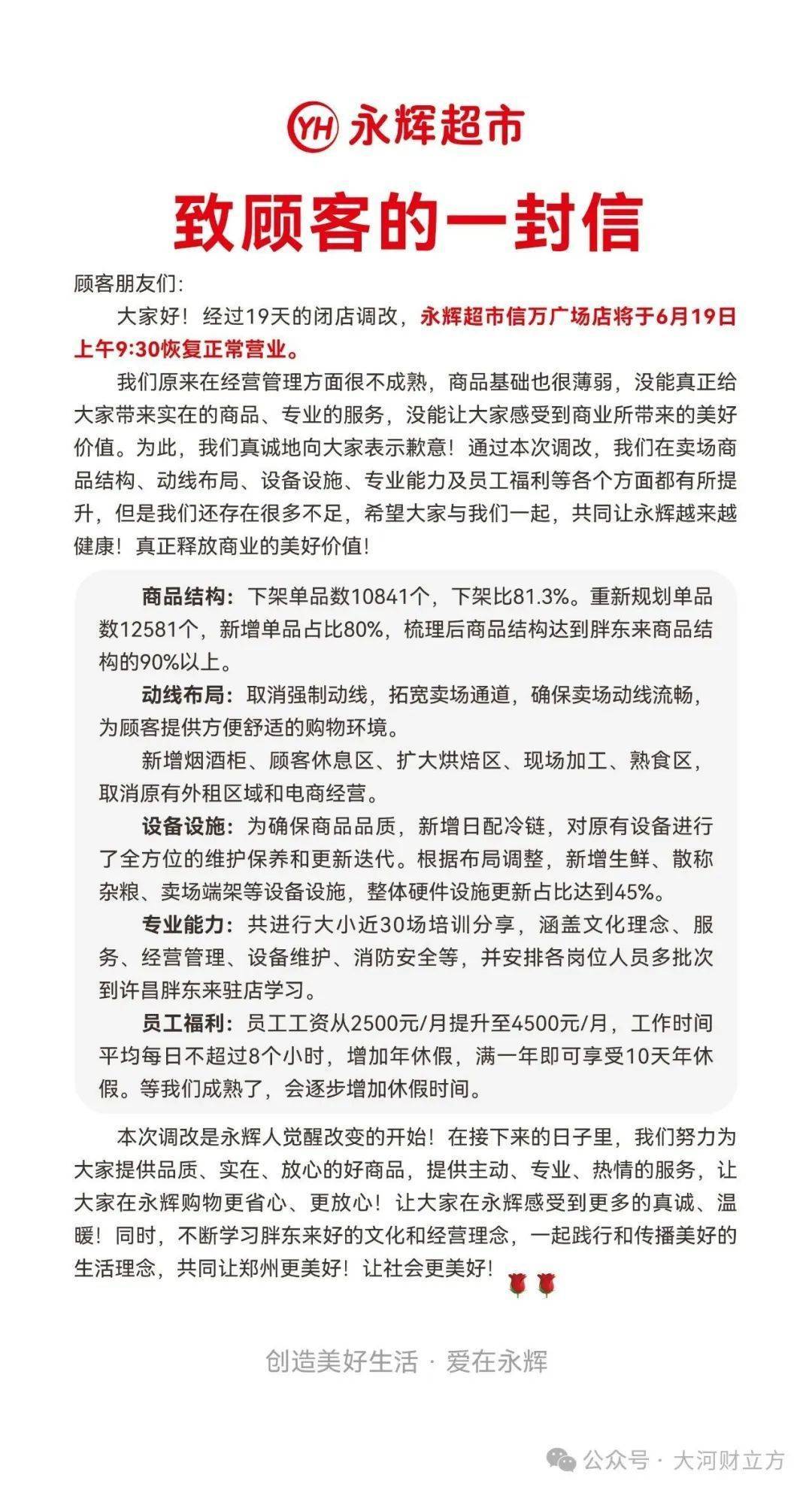信中透露了改造的细节,商品结构方面,下架单品数10841个,下架比81.3%。重新规划单品数12581个,新增单品占比80%,梳理后商品结构达到胖东来商品结构的90%以上。
