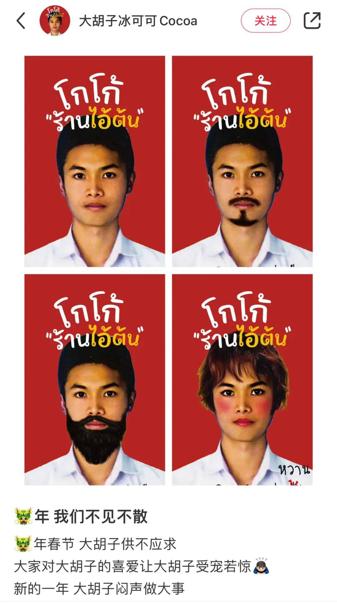 比如,大胡子冰可可将创始人高中时期的证件照作为品牌logo,将产品的可可浓度分为4档,并且以胡子的长短度来形象表示。其中,没胡子的版本就是淡可可、小胡子版本就是淡可可,大胡子则是浓可可,而加糖版本则直接演化成了创始人的甜美大头贴。同时,品牌还会根据季节变化。上线季节限定新品,如泰式粘粘奶、冰淇淋等。