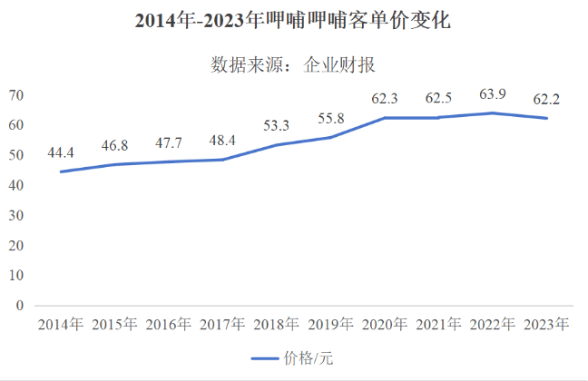 但上市后,呷哺呷哺离初心越来越远,2014年-2023年,其每年都在提价,客单价由44.4元,升至62.2元,涨幅超过40%。和2011年的35.2元客单价相比,涨幅更是高达76.7%。
