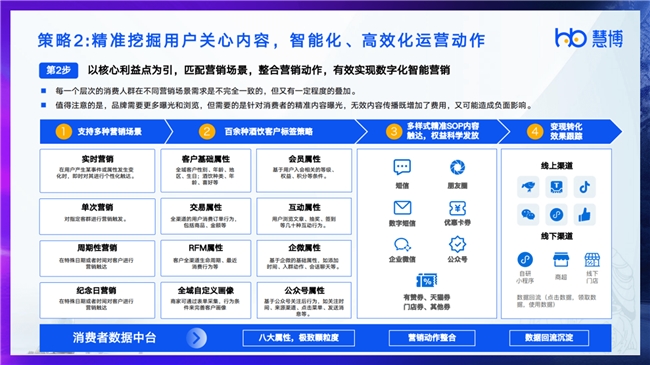 结合丰富的品牌服务实操经验,慧博科技提出,公域私域的高效融合是推动品牌增长的重要途径。在公域平台上,酒企可以通过广告投放、内容营销等方式吸引潜在消费者;而在私域平台上,酒企则可以通过会员管理、社群运营等方式与消费者建立更加紧密的联系,实现深度的用户运营和转化。