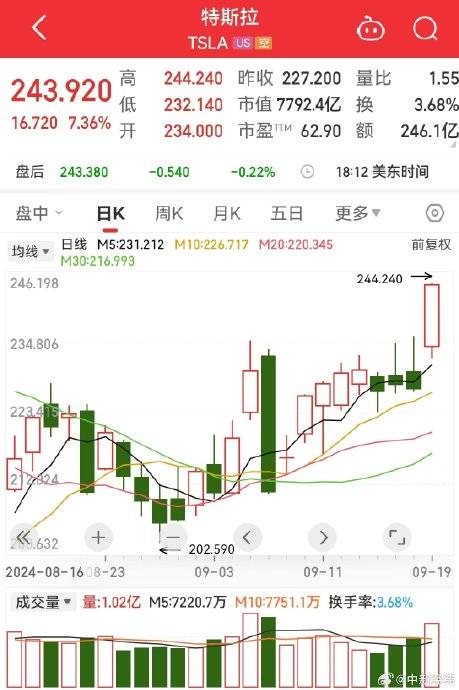 当地时间9月19日,特斯拉涨超7%,创7月下旬以来收盘新高,市值一夜大增534亿美元(约合人民币3774亿元)。