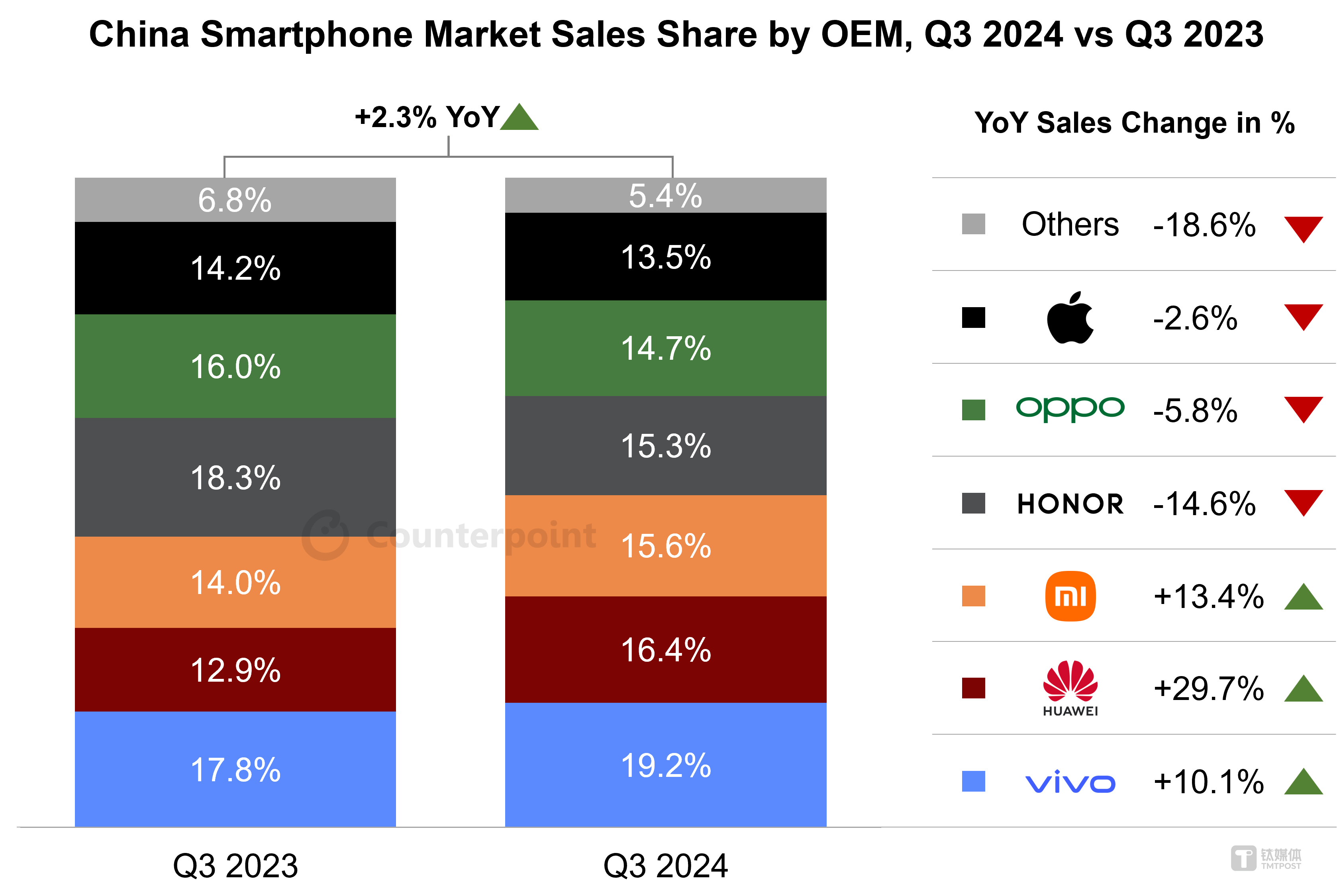 在苹果这边动态调整渠道和营销策略的同时,国产手机品牌也发生了一些变化。vivo三季度继续位居中国智能手机市场第一,今年前三个季度合计出货量也保持首位。小米国内市场出货量连续第五个季度出货量保持同比增长,第三季度凭借14.8%的市场份额上升到第四位。