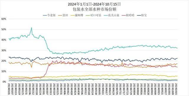 另有相关人士描述了当时的背景:受到一季度舆情影响以及友商的攻势,农夫山泉最为关键的基本盘业务“红瓶天然水”的市场份额在三月中旬出现了波动。某第三方机构提供给虎嗅的市场调研数据显示,在2024年1月初,农夫山泉红瓶天然水在整个瓶装水市场的份额达到39.7%以上。在一季度的巅峰时段,农夫山泉的市场份额一度甚至达到了50%以上,但是到了3月中旬这一份额(红瓶天然水为主)一度下降至25%~27%的区间。
