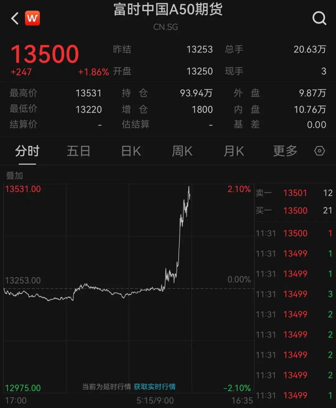 富时中国A50指数期货盘中直线拉升,一度涨超2%,截至发稿,涨幅为1.86%。