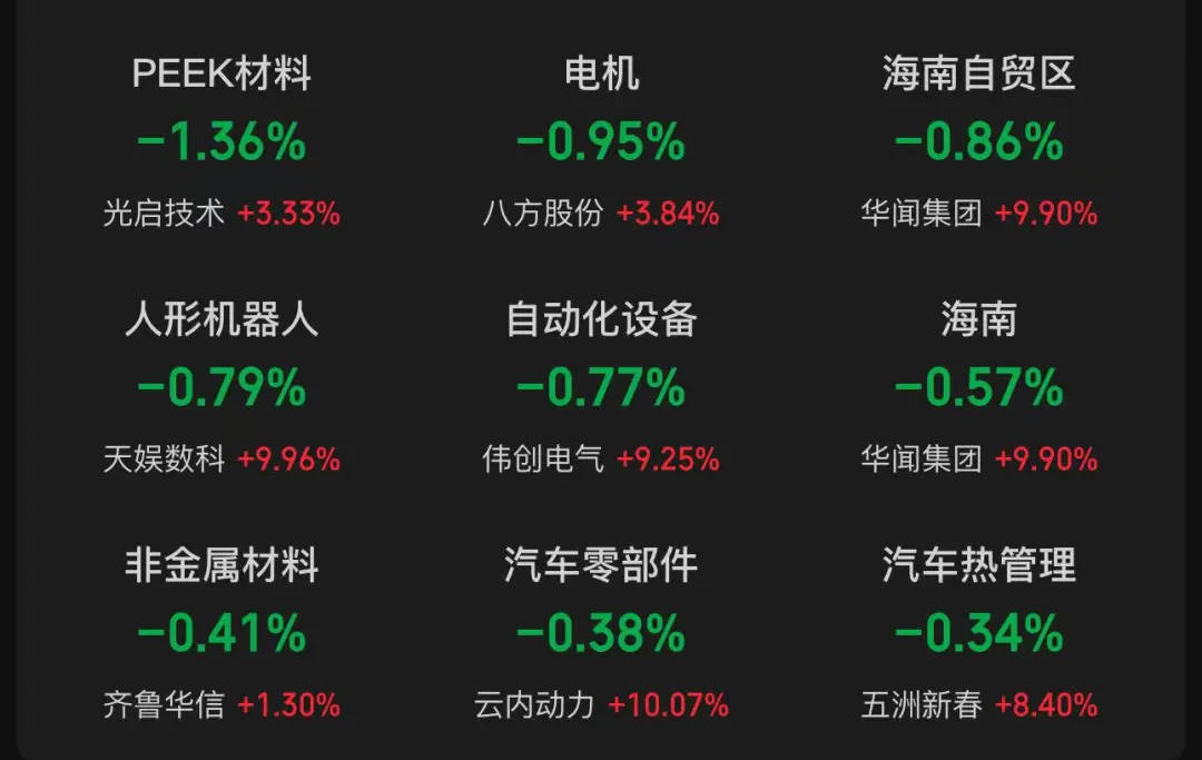 盘面上,保险概念、(sora概念)文生视频、互联网保险、文化传媒、教育、AI语料、云办公、手机游戏、房地产等板块涨幅居前,PEEK材料、电机、人形机器人、自动化设备、海南自贸区、非金属材料等板块跌幅居前。