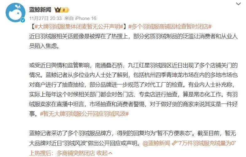但是大品牌的产品质量就值得信赖吗?此前就“羽绒风波”采访了多家知名羽绒服品牌方,得到的回复均为“暂不方便表态”,没有对“羽绒风波”做出公开回应或声明。