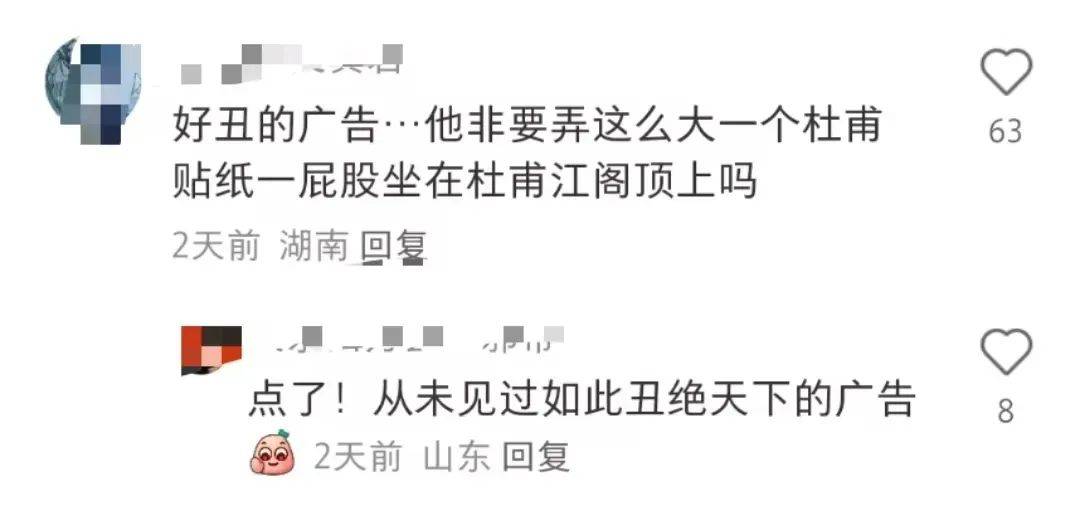 有网友则从审美的角度进行批判,认为被丑到了。由于杜甫江阁是长沙的标志性建筑,杜甫这么一屁股坐在上面,恶心的不仅仅是茶颜悦色,还有长沙本地网友。