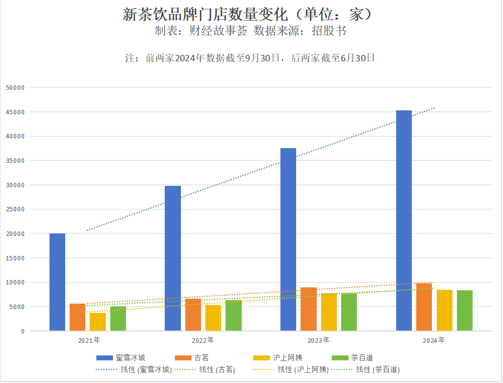 成立前10年,蜜雪冰城只开了1家店,从1000家到10000家,蜜雪冰城花了6年时间,再从万家门店增长到20000家,仅仅耗时两年。2024年,蜜雪冰城首次在港股申请IPO时,门店规模是36153家。今年元旦,蜜雪冰城给出的数据变成了45282家,而在同一赛道上,截至2024年前9个月,排在第二的古茗门店也没到万家。