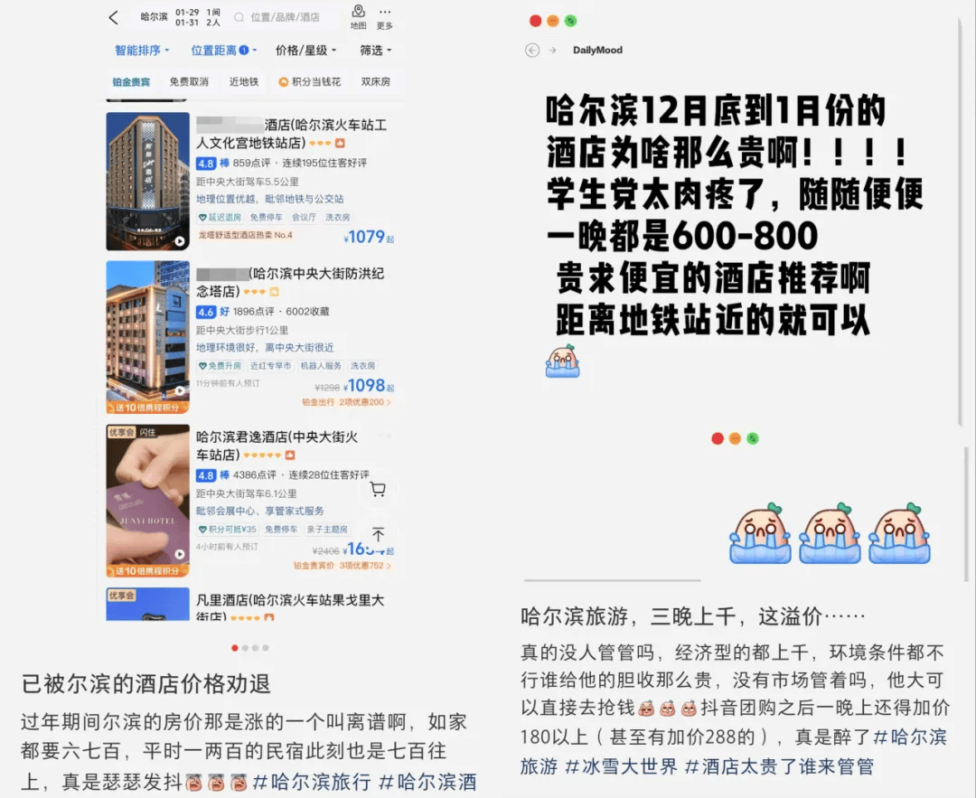 早在2023年冬季,多个社交平台上就已经开始有零星吐槽哈尔滨酒店涨价乱象的声音。