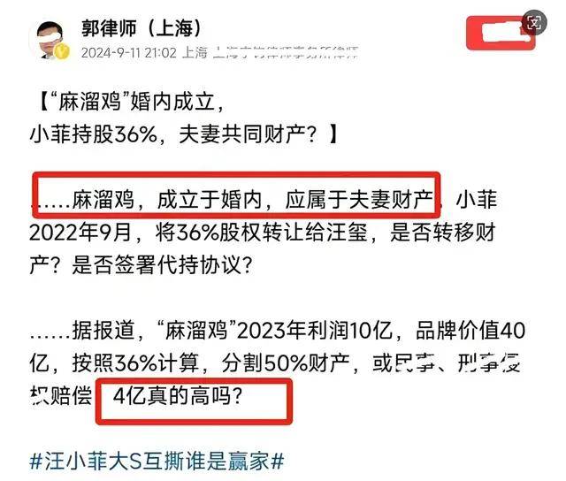 对此,上海的郭律师表示,汪小菲在婚姻生活中创建的麻六记品牌,应当被看作是夫妇之间的共有资产。按照这一法律准则,大S有权提出分割这部分财产的要求,她提出的索赔金额4个亿,实际上并不算高。