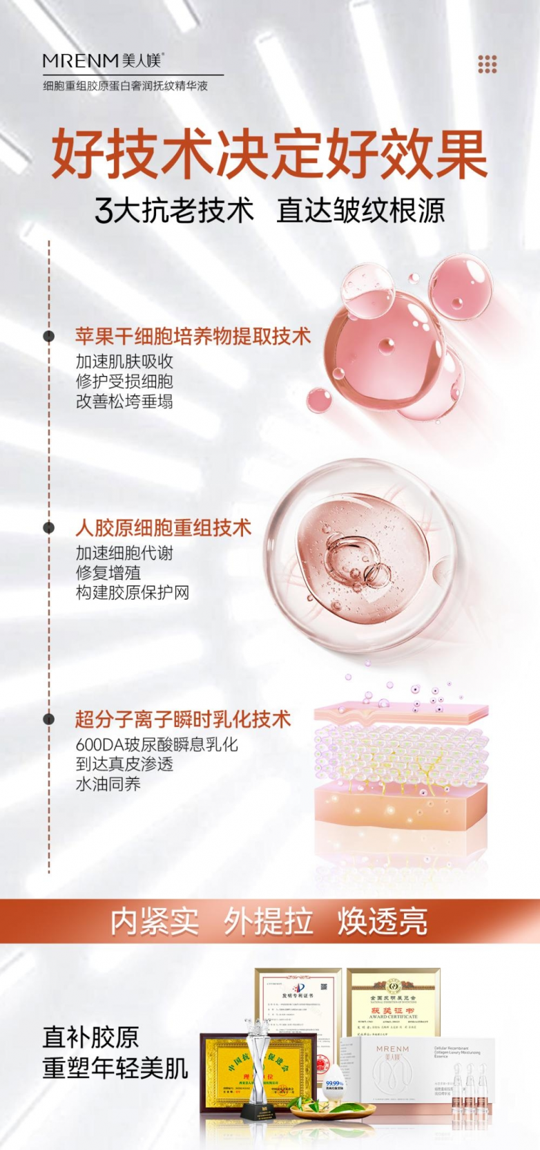 传统护肤品仅能浅层修护,而真正的衰老始于胶原结构的坍塌,美人媄「活细胞胶原舱」以四大核心科技直击衰老本质:胶原重组技术,仿生人体胶原结构,在肌底构建三维弹力网,重塑面部"年轻骨架";苹果干细胞科技:源自瑞士雪域高原的珍稀苹果干细胞中萃取活性成分,如同给细胞装上"青春加速器",纳米透皮技术:突破性600Da微分子技术,突破性实现有效成分直达真皮层