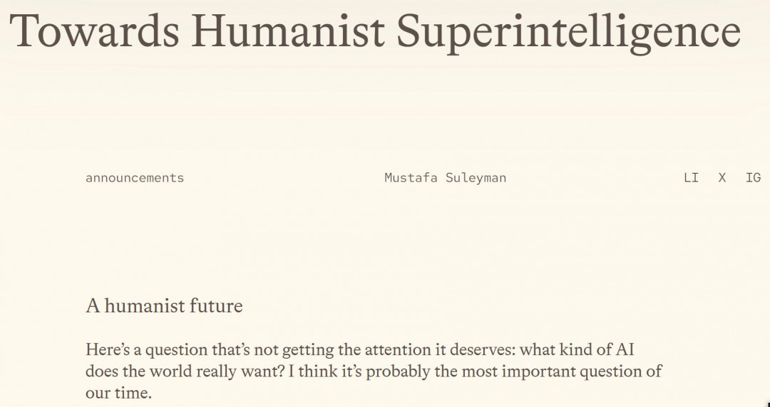 【TechWeb】11月8日消息,据外媒报道,微软 AI 部门 CEO 穆斯塔法・苏莱曼日前发布长文,阐述了微软对AI研发的态度,反对 “通用人工智能(AGI)竞赛” 的叙事,并宣布成立一个新团队,专门开发“以人为本的超级智能”(Humanist Superintelligence,HSI)。