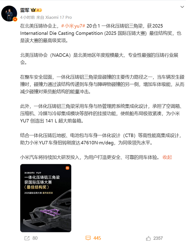 这一安全理念在小米YU7车型上得到了充分体现。据最新消息,在北美压铸协会举办的2025国际压铸大赛上,小米YU7搭载的20合1一体化压铸铝三角梁荣获最佳结构奖,这也是该大赛的最高级别奖项。北美压铸协会作为北美地区年度规模最大、专业性最强的压铸行业展会,其奖项具有极高的行业权威性。