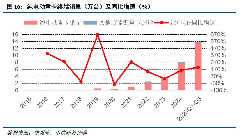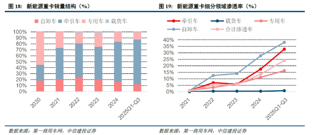 新能源销量增速或边际放缓,出口提振下传统能源有望持稳。2026年国内新能源购置税减免即将退坡,叠加补贴政策不确定性,新能源重卡将全面转入市场驱动阶段,增速预计边际放缓。基于目前应用场景和销量结构测算,2026年新能源渗透率或在30-35%。低运价背景下燃气车主导长途牵引领域,受中短途电动化影响较小,国内渗透率、总量预计同比保持稳定。出口以油车为主,2026年增量可填补国内柴油车销量下滑缺口。
