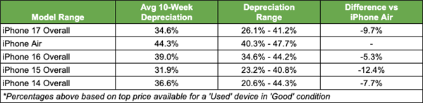 数据显示,iPhone 17系列发售十周后的平均贬值率为34.6%,表现优于去年同期的iPhone 16系列(iPhone 16系列贬值率为39%)。