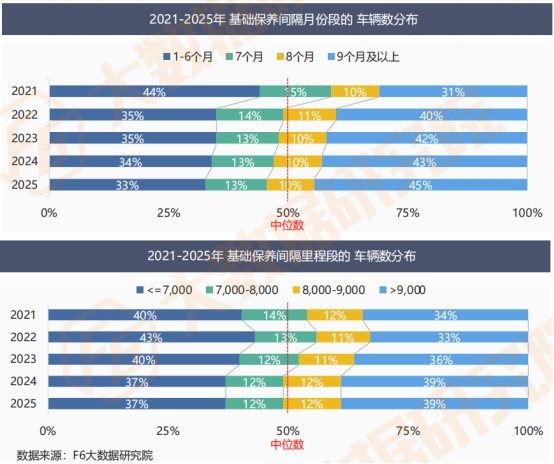 从保养间隔里程来看,变化同样突出:2023年之前,车主基础保养间隔里程中位数集中在7,000-8,000公里,而近2年这一中位数已后移至8,000-9,000公里,间隔里程显著拉长。