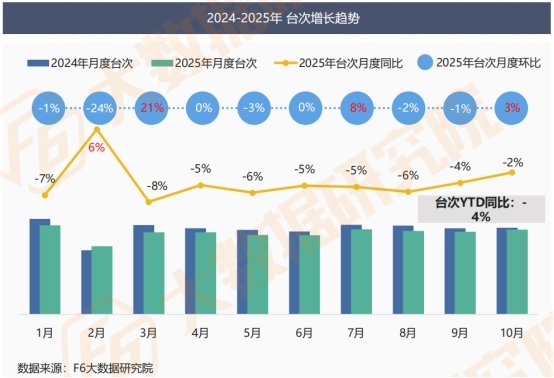 剔除春节因素,2025年后市场各月台次均同比下跌,但当前月度同比降幅已明显收窄,截至10月,累计台次YTD同比下滑4%。