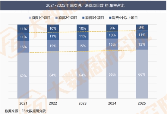 2025年,车主在车辆维保过程中的消费行为呈现出更明显的“精简化”特征:单次进厂消费4个及以上项目的车主占比进一步降至8%,这一数据不仅创下新低,更延续了近三年来持续下滑的走势,反映出多项目打包消费的模式正逐渐被车主摒弃。