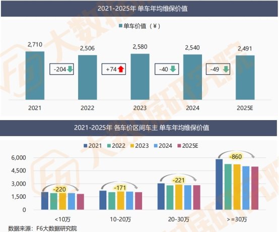 2025年,车主单车年均维保价值延续2024年的小幅下滑走势,已跌破2,500元。