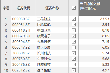 上证报中国证券网讯(记者 费天元)数据显示,12月4日,资金净流入额排名前十的个股依次是三花智控(002050)、巨轮智能(002031)、中国卫星(600118)、航天电子(600879)、天孚通信(300394)、航天发展(000547)、长川科技(300604)、宁德时代(300750)、胜宏科技(300476)、达华智能(002512)。其中,三花智控、巨轮智能等均属于机器人概念。