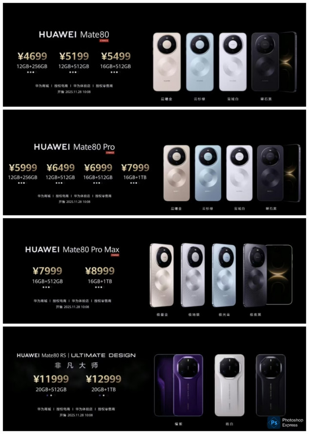 从此次官方制定的价格体系来看,华为Mate 80系列延续了“加量不加价”的诚意,全系共推出四款机型,覆盖不同用户需求:Mate 80标准版12+256GB版本4699元起,12+512GB版本5199元,16+512GB版本5499元;Mate 80 Pro 12+256GB版本5999元起,顶配16+1TB版本7999元;Mate 80 Pro Max 16+512GB版本7999元,16+1TB版本8999元;Mate 80 RS非凡大师20GB+512GB版本11999元,20GB+1TB版本12999元。